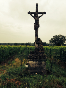Övervakning av vingård. Texten under krucifixet är på tyska, och berättar om korsfästelsen.